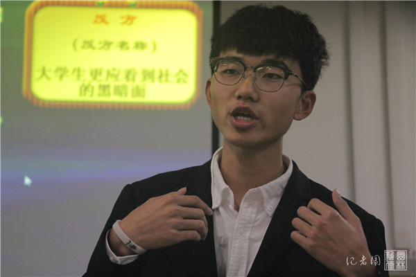 短暂的中场休息后,激动人心的冠军争夺赛开始了。双方辩题为“大学生更应该看到社会的光明面还是黑暗面”。正方是第一组,观点为“大学生更应该看到社会的光明面”;反方为第四组,持有观点“大学生更应该看到社会的黑暗面”。双方辩手旁征博引,交锋激烈,从大学生的思想价值标准、社会发展与历史经验等方面进行辨证。场下观众激情澎湃,掌声连连响起。正方四辩总结陈词时表示,更应该看到光明面能够完善大学生价值观,对大学生起到应有的楷模作用,更是利于社会稳定的积极引导。反方四辩则表示,不否认看到社会的光明面所能带来的益处,但更应该了解社会的黑暗面,去了解,去行动、去改变、于黑暗之中衍生出更多的光明。双方在气势与谈吐中都不相上下。整场比赛过程中赛场气氛紧张热烈,观赛学生也热情参与,互动环节更是将现场气氛活跃起来。最终正方获胜,摘得桂冠。反方辩手韦伊妮荣获本场“最佳辩手”称号。