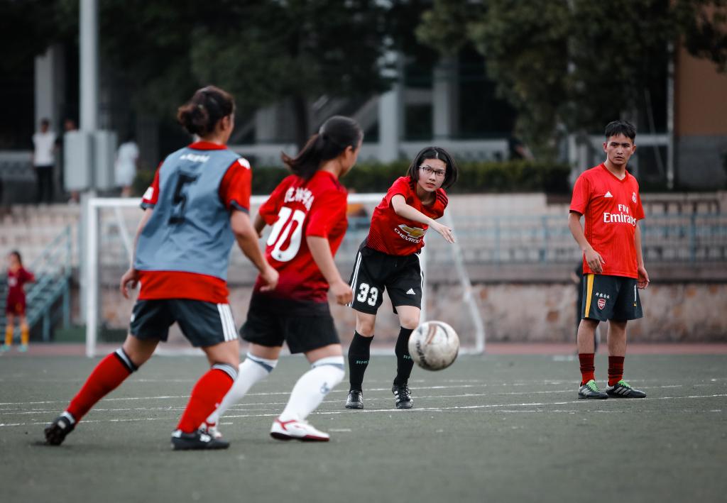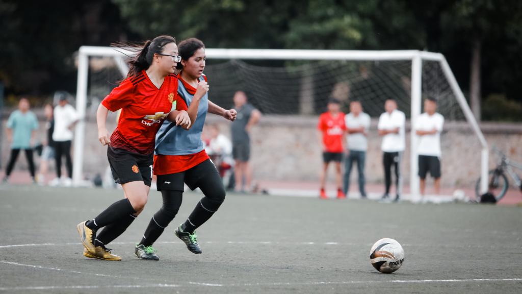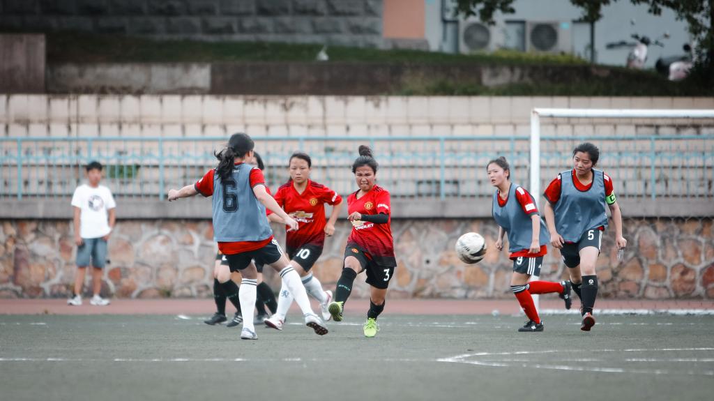 晚六点,球队队员陆续到达第一运动场,队长黄静一边带领队员们进行热身,一边安排战术。身穿红色队服的女足队员们成为了田径场上一抹绚丽的色彩。