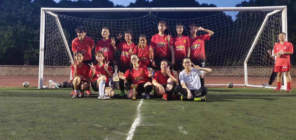 颁奖仪式上,我院女子足球队队员们捧着奖杯合影留恋。
