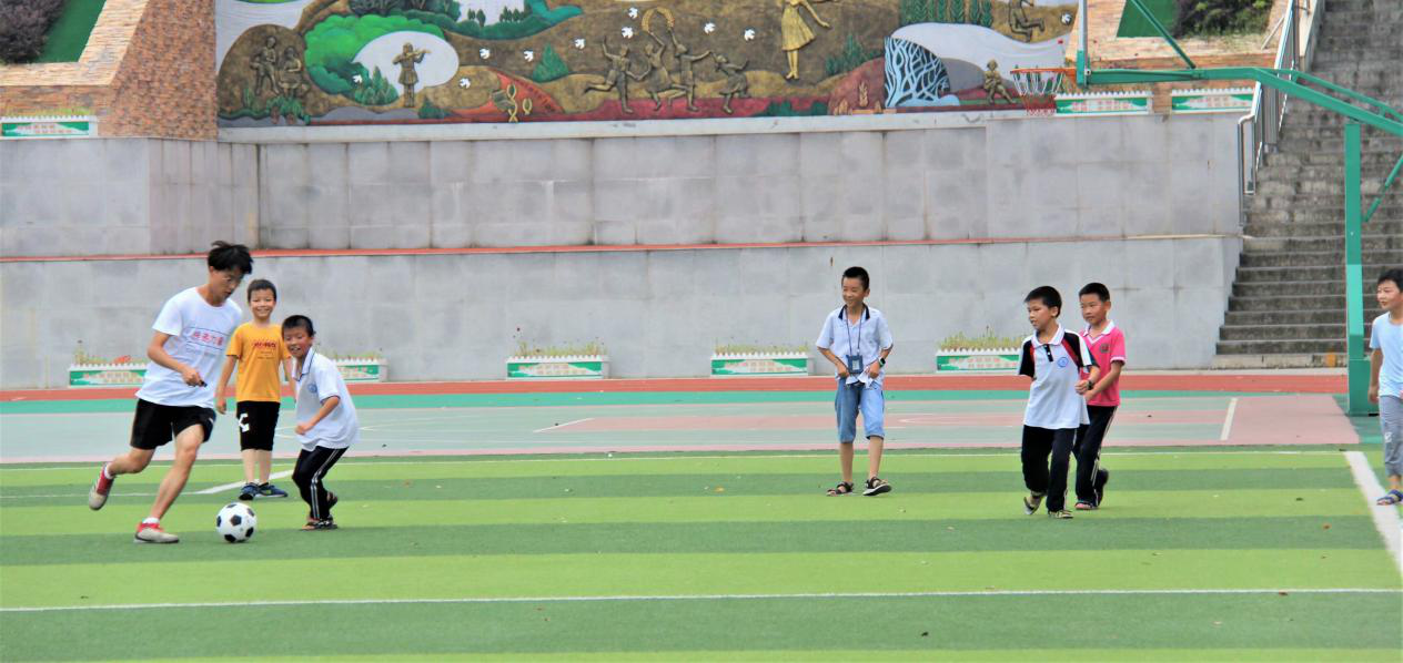 足球场上,在支教队员的指导下,孩子们在操场上纵情飞奔,享受着足球运动带给他们的健康快乐。据悉,由于时间限制和师资原因,孩子们平时很少踢足球,此次夏令营队员们特意设置了足球课。除此之外,还设置了篮球课,户外素质拓展,旨在培养孩子们对运动的兴趣和热爱。