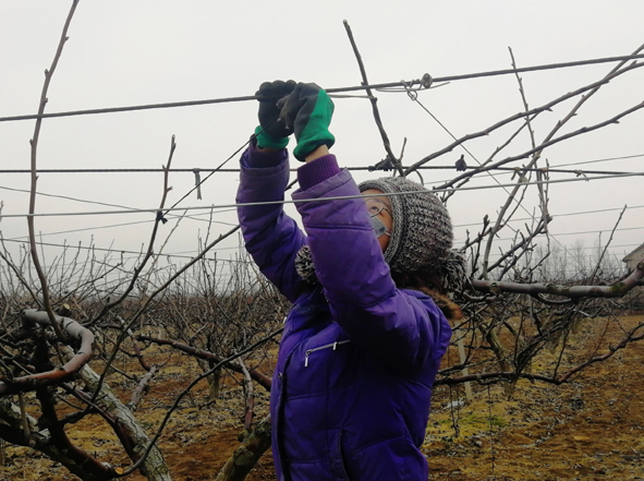 以优异成绩保送研究生的赵芳梦,回到自己的家乡——山东莱阳河洛镇赵家埠子村后,也积极加入到春耕复产的行列中。在自家梨园,她负责修剪距离地面2米多的位置、东西南北交错成1m*1m网格状的钢丝网架,同时协助家人修整树形。据赵芳梦介绍,钢丝网架的作用是支撑枝条,通过把枝条借绳条牵引到钢丝网架上,可利于修整树形,平衡树势,便于梨树合理的坐花坐果,也防止果实成熟后把枝条坠断。她表示,一说起春耕,人们经常想起学校里学过的一句诗,“锄禾日当午,汗滴禾下土” ,而只有实际体验春耕后才明白稼穑之艰。在劳动中,她体会到父母的不易,并十分珍惜这次长期在家的机会,既能帮父母分担一些劳累,也有难得的陪伴。“自己目前的理论知识和实践还有一些脱节,以后要理论多结合实践。”赵芳梦总结道,当前家乡的耕作形式急需进行土地改革与农业改革,发展智慧农业,现代农业,就急需农学学子有投身现代农业的志愿和热忱,以实际行动实现“勤读力耕立己达人”的精神,此外,她已报名加入村里的防疫工作,打算为蚬河流过的梨乡作出自己的贡献。