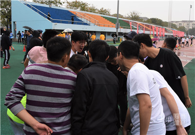 集合完毕后,运动员在细雨中进行试跳。校党委书记高翅身着雨衣,亲临现场进行指导。在不断的磨合中,运动员逐渐找到节奏,配合越发娴熟。他们互相加油鼓劲,一起大声喊出:“园林,加油!”