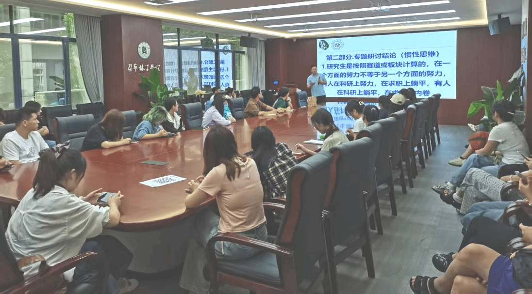 在专题研讨环节,辅导员肖晗以我校学生与武汉大学学生求职状况对比为切入点,深入剖析了我校研究生群体在科研与求职中的惯性思维误区,强调“早规划、早行动”的重要性,并结合案例鼓励同学们根据自身情况合理选择求职或升学路径。