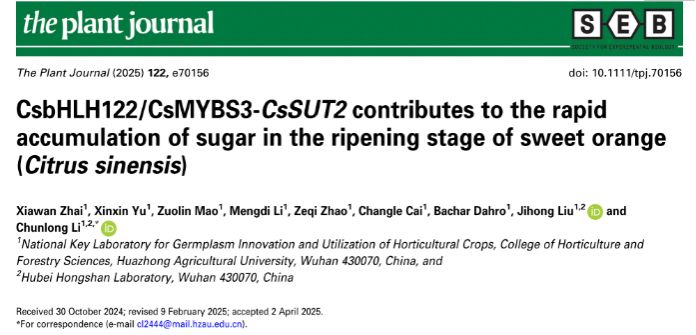 近日,ok138cn太阳集团529刘继红/李春龙团队在The Plant Journal在线发表了题为“CsbHLH122/CsMYBS3-CsSUT2 contributes to the rapid accumulation of sugar in the ripening stage of sweet orange (Citrus sinensis)”的研究论文。研究证明柑橘糖转运蛋白CsSUT2具有蔗糖转运功能,并通过遗传转化和分子生物学技术揭示了CsbHLH122/CsMYBS3-CsSUT2模块如何在果实成熟阶段促进糖分积累的分子机制。