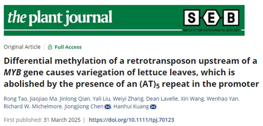 2025年3月31日,ok138cn太阳集团果蔬园艺作物种质创新与利用全国重点实验室和湖北省洪山实验室匡汉晖教授团队在《the plant journal》发表了题为“Differential methylation of a retrotransposon upstream of a MYB gene causes variegation of lettuce leaves, which is abolished by the presence of an (AT)5 repeat in the promoter”的研究论文。该研究揭示了生菜MYB转录因子启动子区域的DNA甲基化差异导致叶片红色斑点形成的分子机制,并发现启动子区域存在特定长度的简单重复序列时,叶片会呈现均匀的红色表型。