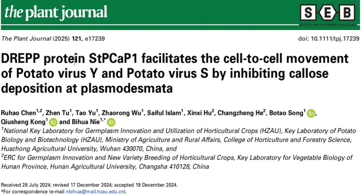 近日,ok138cn太阳集团马铃薯团队聂碧华课题组在The plant Journal在线发表了题为“DREPP protein StPCaP1 facilitates the cell-to-cell movement of Potato virus Y and Potato virus S by inhibiting callose deposition at plasmodesmata” 的研究论文。研究发现马铃薯Y病毒(PVY)和马铃薯S病毒(PVS)的运动蛋白通过招募马铃薯感病因子StPCaP1来抑制胞间连丝处胼胝质合成,揭示了PVY和PVS病毒通过StPCaP1调控胞间连丝通透性来促进病毒细胞间移动的机制。