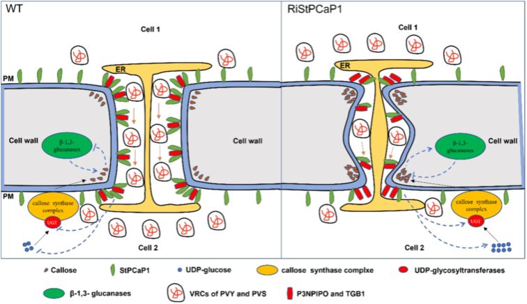 本研究发现, 马铃薯DREPP家族成员StPCaP1基因沉默后能赋予马铃薯同时对PVY和PVS两种病毒的抗性。PVY和PVS的运动蛋白P3NPIPO和TGB1与StPCaP1互作,并在胞间连丝处招募StPCaP1;进一步的研究表明StPCaP1通过调控与胼胝质合成相关的UDP葡萄糖基转移酶(UGTs)表达水平和葡萄糖含量来影响胞间连丝处的胼胝质沉积水平,从而调控胞间连丝通透性和病毒的细胞间移动。本研究深化了DREPP家族作为感病因子参与病毒运动的理解,对利用感病基因来进行马铃薯抗病毒遗传改良提供了的理论基础。