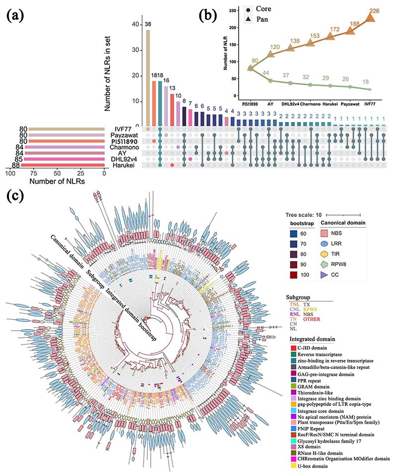 随后,该研究鉴定了甜瓜基因组中的抗性基因类似物(RGA)并对NLR类型的RGA进行重新注释。在PI511890基因组上注释到80个NLR,其中64个NLR成簇分布。该研究进一步对6个已发表的甜瓜基因组的NLR进行了重新注释,构建了一个包含226非冗余NLR的泛NLR组。该泛NLR组包含18个核心NLR基因和208个可变NLR基因。该研究结果不仅为甜瓜遗传改良提供了高质量的基因组资源,同时还为甜瓜抗病基因发掘提供首个可作为无偏参考的泛NLR组。
