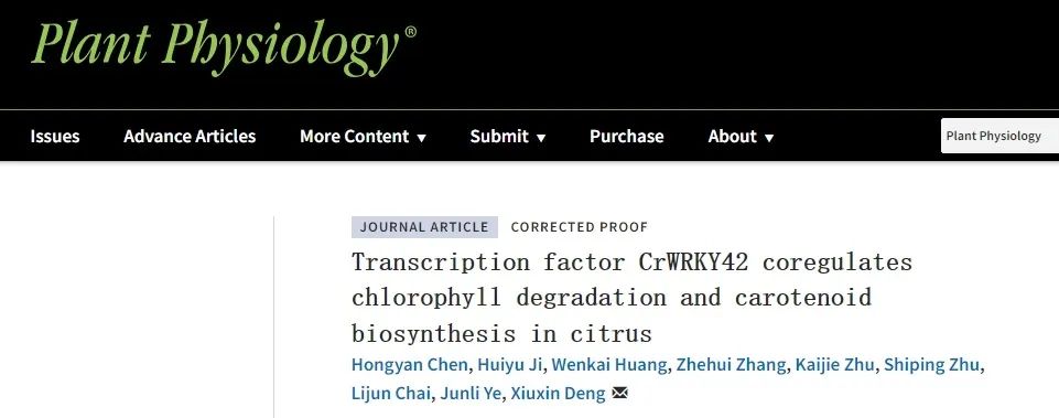 近日,ok138cn太阳集团529/果蔬园艺作物种质创新与利用全国重点实验室邓秀新院士团队在Plant Physiology在线发表了题为“Transcription factor CrWRKY42 coregulates chlorophyll degradation and carotenoid biosynthesis in citrus”的研究论文。该研究解析了转录因子CrWRKY42通过协同调控叶绿素降解和类胡萝卜素生物合成途径促进柑橘果实着色的分子机制,该研究结果为柑橘果实色泽品质遗传改良提供了理论依据和重要基因资源。