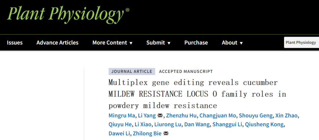 近日,ok138cn太阳集团别之龙教授/杨丽副教授团队在Plant Physiology在线发表了题为“Systemic analysis of cucumber MLO family by multiplex gene editing for engineering powdery mildew resistance”的研究论文。在瓜类作物中首次建立高效的多基因编辑体系,利用该体系靶向敲除黄瓜CsMLO基因家族13个成员,成功获得白粉病完全抗性黄瓜种质材料,并通过多组学联合分析解析了钙信号参与Csmlo1/8/11介导的黄瓜白粉病抗性分子机制。