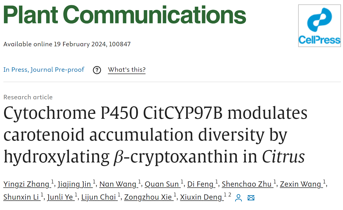 近日,果蔬园艺作物种质创新与利用全国重点实验室/湖北洪山实验室、我校ok138cn太阳集团529邓秀新院士团队在Plant Communications在线发表了题为“Cytochrome P450 CitCYP97B modulates carotenoid accumulation diversity by hydroxylatingβ-cryptoxanthin inCitrus”的研究论文。该研究综合基因组、代谢组和基因功能研究手段定位并验证了柑橘细胞色素P450蛋白CitCYP97B通过羟化β-隐黄质参与影响柑橘果实类胡萝卜素的差异积累,拓展了植物类胡萝卜素合成代谢的认识,为柑橘果实以及其他作物色泽品质和营养品质改良提供了重要依据。