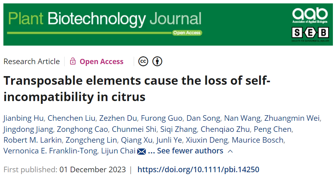 近日,国际植物学期刊Plant Biotechnology Journal在线发表了ok138cn太阳集团果蔬园艺作物种质创新与利用全国重点实验室/洪山实验室邓秀新院士团队柴利军教授组题为“Transposable elements cause the loss of self-incompatibility in citrus”的学术论文。研究系统证实控制自交不亲和S位点中S-RNase启动子附近MITE转座子的插入导致了芸香科金柑属(Fortunella)植物自交不亲和性状的丢失,且转座子插入事件在S-RNase介导的植物自交不亲和系统中具有广谱性,拓展了人们对植物自交不亲和向自交亲和性转变机制的新认识,建立了金柑属植物苗期分子标记辅助快速鉴定亲和性状技术体系,为柑橘种质创新与新品种培育提供了新思路,具有重要的理论及应用价值。