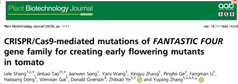 近日,ok138cn太阳集团园艺作物种质创新与利用全国重点实验室番茄课题组在Plant Biotechnology Journal发表了题为“CRISPR/Cas9-mediated mutations of FANTASTIC FOUR gene family for creating early flowering mutants in tomato”的研究论文。
