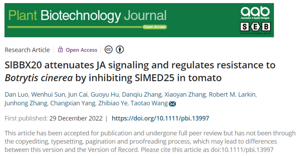 近日,ok138cn太阳集团番茄团队王涛涛教授课题组在国际权威学术期刊《Plant Biotechnology Journal》发表了题为《SlBBX20 attenuates JA signaling and regulates resistance toBotrytis cinereaby inhibiting SlMED25 in tomato》的研究论文。茉莉酸(JA)在调节植物生长和防御反应中发挥着重要作用,研究发现SlBBX20可调控JA的各种响应反应,是一个新的JA响应的负调控因子,JA与灰霉病的抗性密切相关,当过量表达SlBBX20时,番茄对茉莉酸的响应被抑制,导致番茄对灰霉病的抗性减弱。相反,当敲除SlBBX20基因后,JA响应增强,同时显著增强了番茄对灰霉病的抗性。
