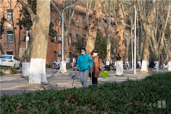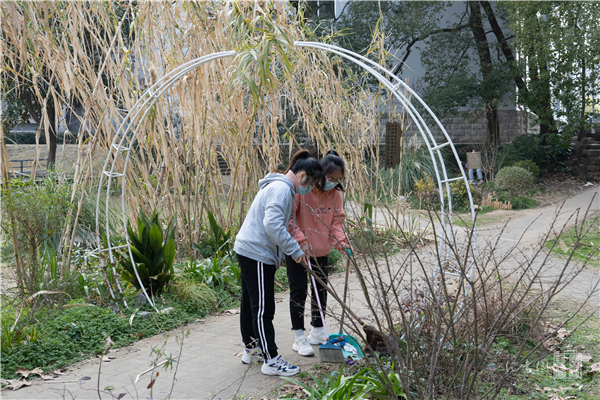 本次清理的区域有景园楼门口的绿地和扇形教室旁边的空地。同学们拿着各种清扫工具在景园楼门口集合,或是用扫帚堆起沉积的落叶,或是用手捡起草丛里掉落的枯枝。经过一小时的努力,景园楼附近变得更加干净整洁。