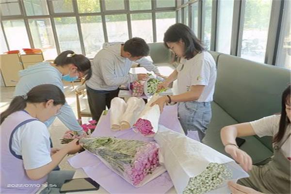 7月10日下午四点,团队成员兵分两路,热火朝天地开始准备工作。一部分成员前往南湖花木城购买插花材料,另一部分成员则准备相关工具并对花材进行处理,包括摘除花刺、除去叶片、修剪花茎以及浸泡切口等。