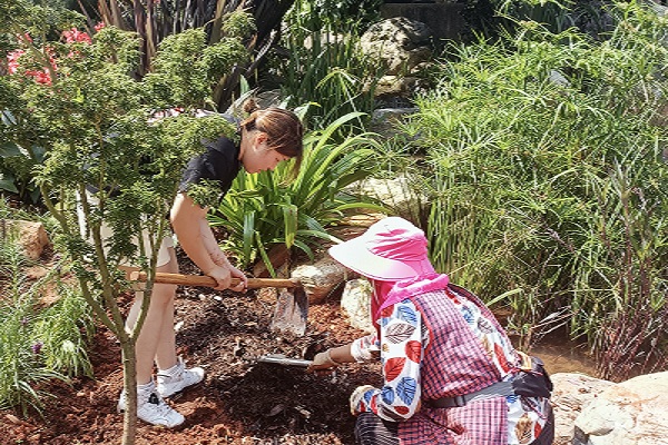 其后实践团尝试对扶荔宫正门处花境进行改造。正门处花境原种植的植物为矮牵牛,由于种植时限久而生长状况不良,已经枯萎死亡,实践团选择将矮牵牛拔除丢弃。在工作人员的配合下,成员们较快地完成改造任务,并参与了植物种植与种后的养护管理。继而,在老师的指导下,实践团学习了新的园艺工具,进行了杂草拔除。