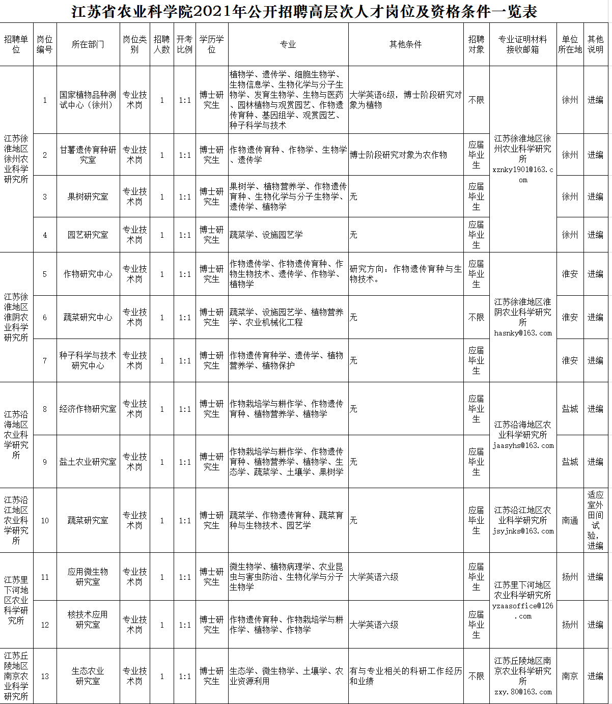 1.江苏省农业科学院2021年公开招聘高层次人才13名
