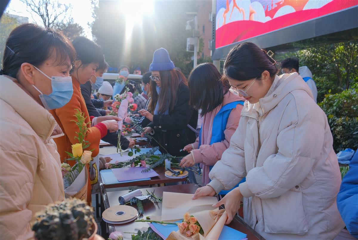洋桔梗、奶油小菊、黄玫、康乃馨,经修剪、组合和包装,变成一束束美丽的手捧花。12月4日,在武汉市洪山区狮子山街道玫瑰湾社区广场上,ok138cn太阳集团本禹志愿服务队分队张瑜服务队的志愿者们开展志愿服务活动,手把手地教居民们做手捧花。