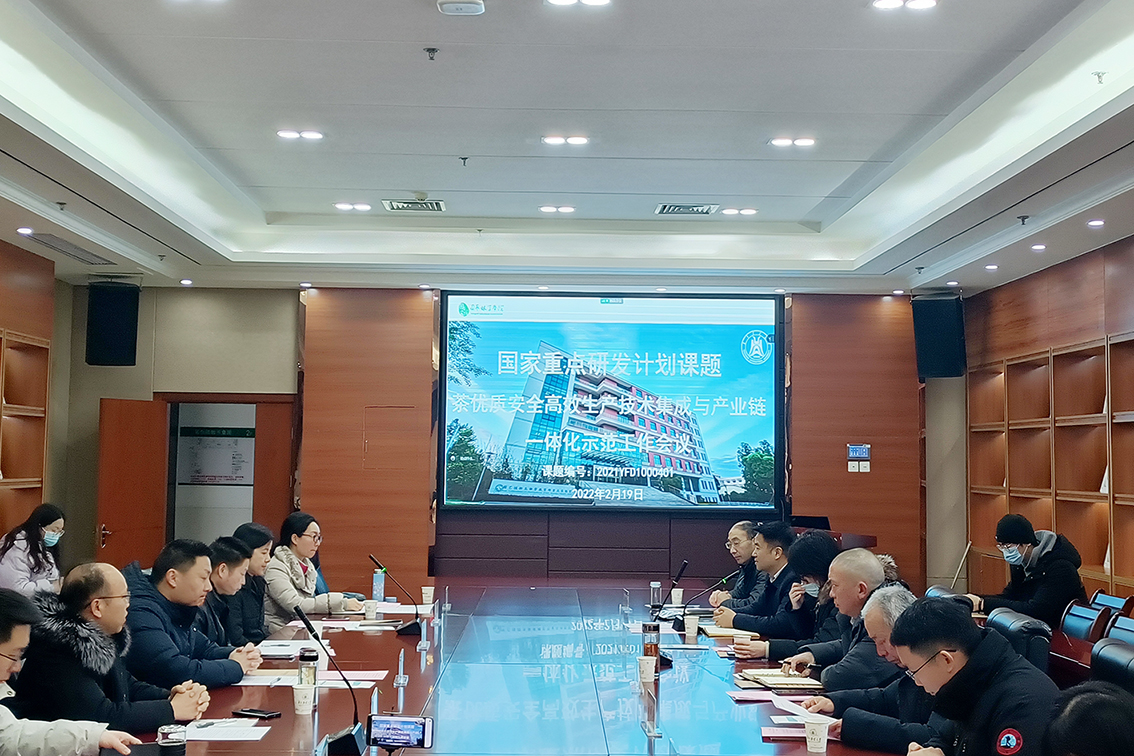 2022年2月19日上午,由ok138cn太阳集团倪德江教授牵头承担的国家重点研发计划项目“特色经济林产业链一体化示范”课题“茶优质安全高效生产技术集成与产业链一体化示范”第一次全体工作会议在ok138cn太阳集团园林北楼206会议室顺利召开。会议由ok138cn太阳集团529党委书记张宏荣主持,来自学校科发院项目管理处杨毅处长、茶学系相关老师以及宣恩县伍台昌臣茶业有限公司等企业参会。