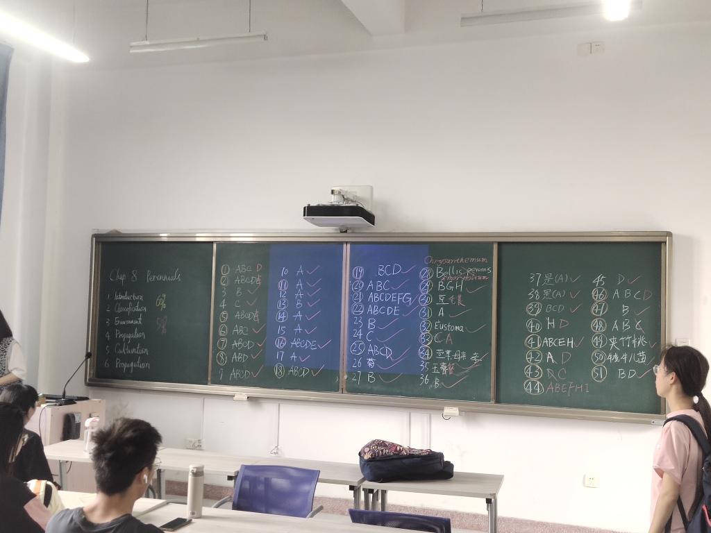 答题活动结束后进行小组讨论,三个小组分别针对本组负责的17题进行自由讨论,形成小组统一答案。在此期间,老师统计答题结果并在黑板上标注正确率偏低的题号,以便同学们开展有针对性的讨论,也指明了后一环节的重点。在讲解过程中,胡慧蓉老师结合答题实际、课内外学习情况,带领大家深入了解并掌握宿根花卉知识,拓展花卉应用视野,提升课程文化品位,师生互动多,课堂氛围好。