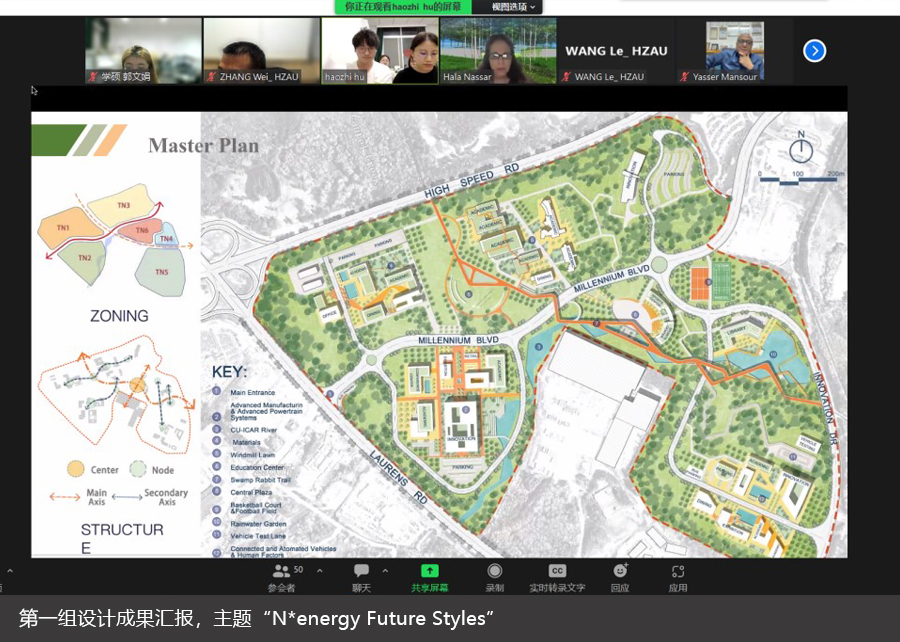 本次设计场地由美国克莱姆森大学提供,基址是位于美国南卡罗来纳州格林维尔市的克莱姆森大学国际机动车研究中心(CU-ICAR)校区,规划面积1.3km2。CU-ICAR是一个以汽车研究为特色,产学研一体的校企合作型校区,拟结合校园发展目标和定位,基于生态、社会和文化特色开展可持续性设计,创造一个促进学习、创造力和合作精神的校园环境,使CU-ICAR成为具备全球影响力的汽车研究、创新和教育园区。本次课程设计由2021级风景园林学29位研究生分组进行设计,基于设计问题开展主题研讨—案例分析—设计研究,结合多轮线上联合汇报促进三方交流与协作。