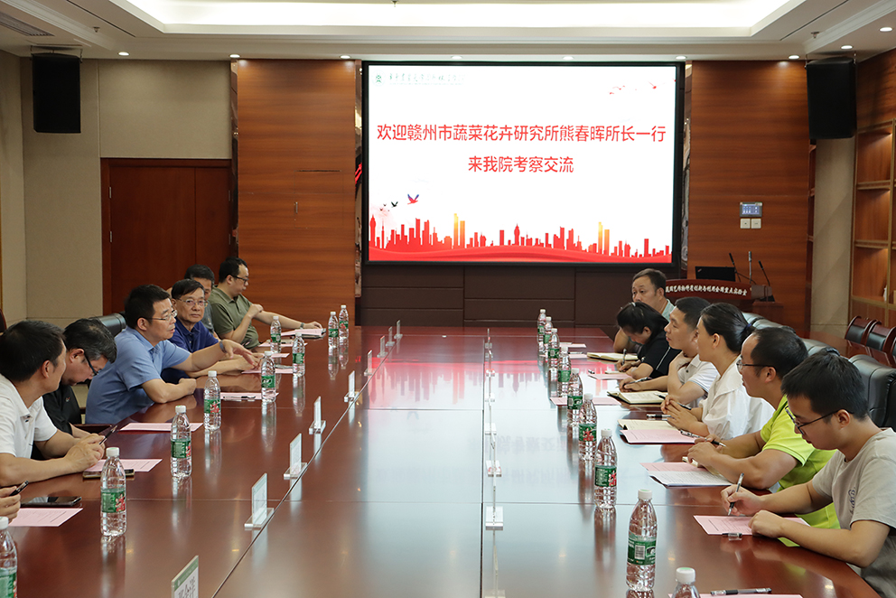 8月26日,赣州市蔬菜花卉研究所熊春晖所长一行来我院考察交流。学院党委书记龙健飞接待了熊春晖所长一行,并举行了座谈会。蔬菜系叶志彪教授、欧阳波教授、卢永恩副教授、张俊红教授、王涛涛教授、张余洋教授、王昕研究员、叶杰副教授和湖北省农业科学院经济作物研究所高升华副研究员及部分研究生代表参加了座谈。