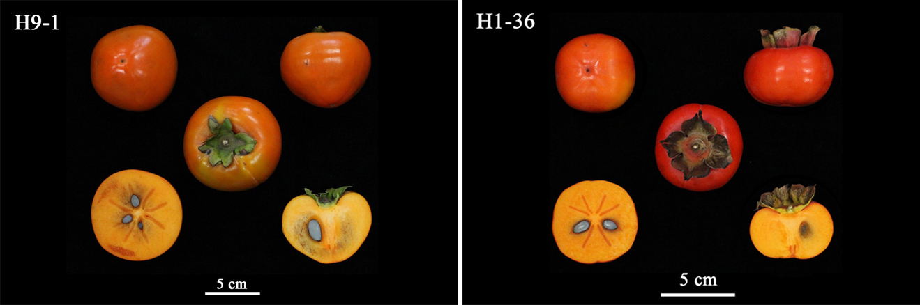 ‘华柿H9-1’和‘华柿H1-36’是国内首次通过人工杂交结合胚抢救、分子标记筛选、嫩枝高接、圃地(武汉)与产区(建始、桂林)测评等技术环节构成的遗传改良技术新体系育成的具有自主知识产权的中国甜柿新品种。