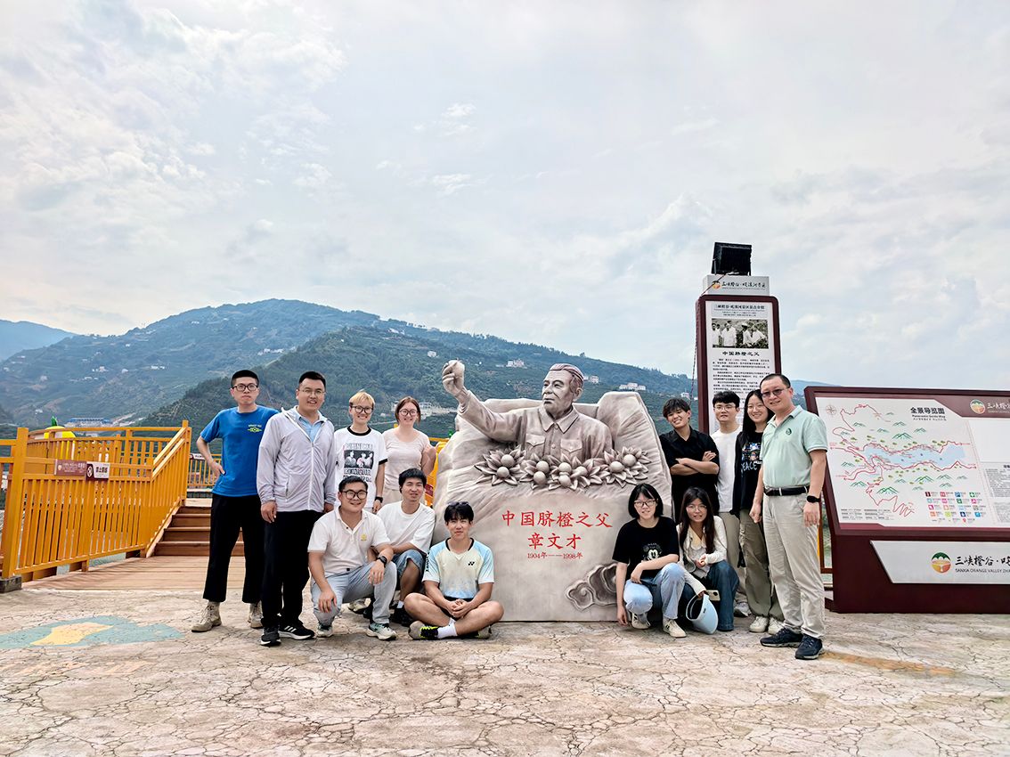 村内,“柑橘十法”壁画生动展示了科研人员与果农的智慧结晶;一江春水,两岸橙香,优美的自然风光与蓬勃的产业图景相得益彰。通过文旅赋能,龙口村有效提升了柑橘品牌影响力和产品附加值,形成了“以旅促农、以农强旅”的良性发展格局,成为秭归“四季鲜橙”产业奇迹的生动缩影。在龙口村长江河畔,师生们庄重瞻仰了由当地村民自发为我校果树学科奠基人、“橘翁”章文才老先生所立的雕像。这尊背倚长江、面向橘山的塑像,不仅静默诉说着一位科学家毕生躬耕果业、心系民生的深厚情怀,更承载着万千因柑橘而脱贫致富的果农对他无尽的敬意与感激。