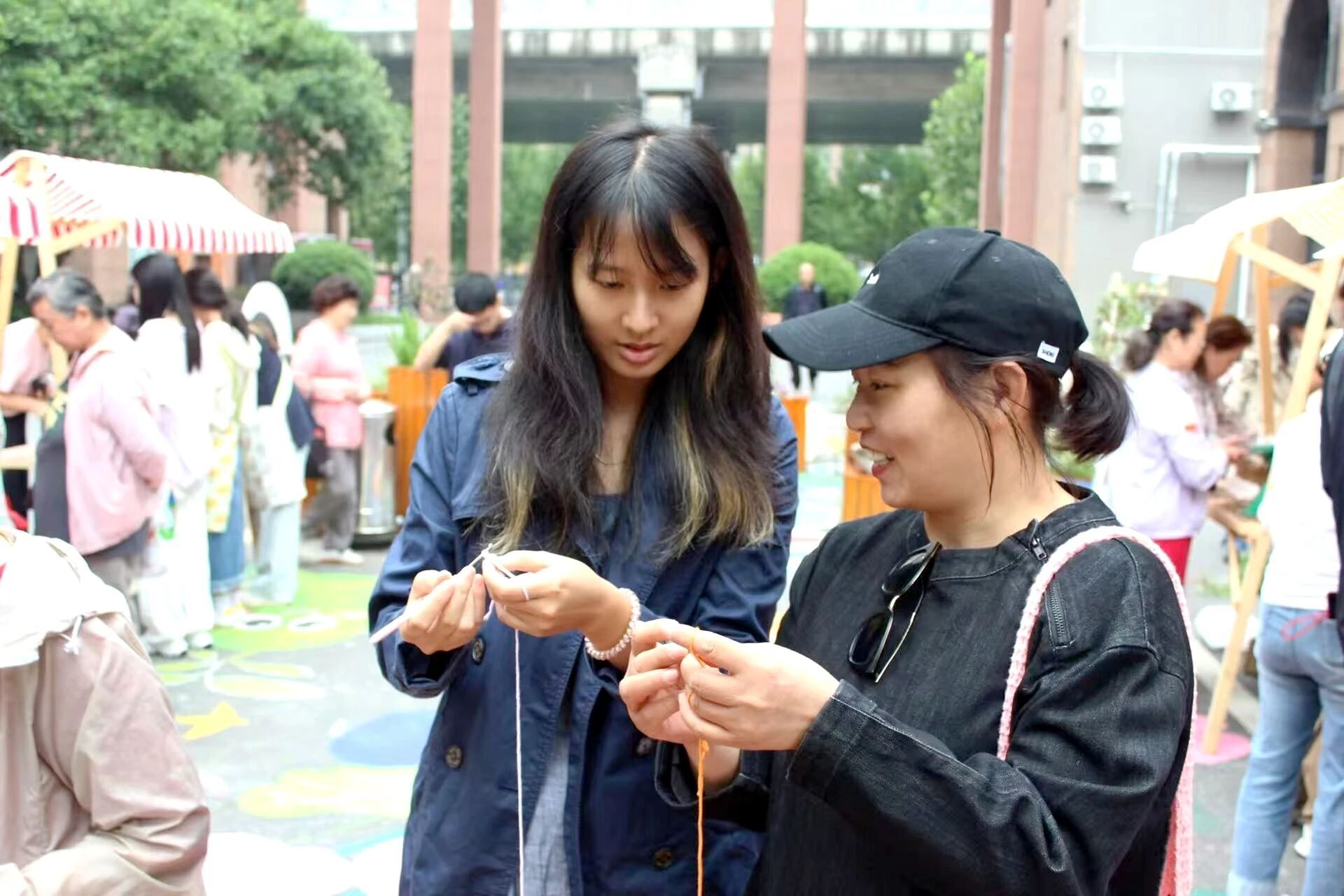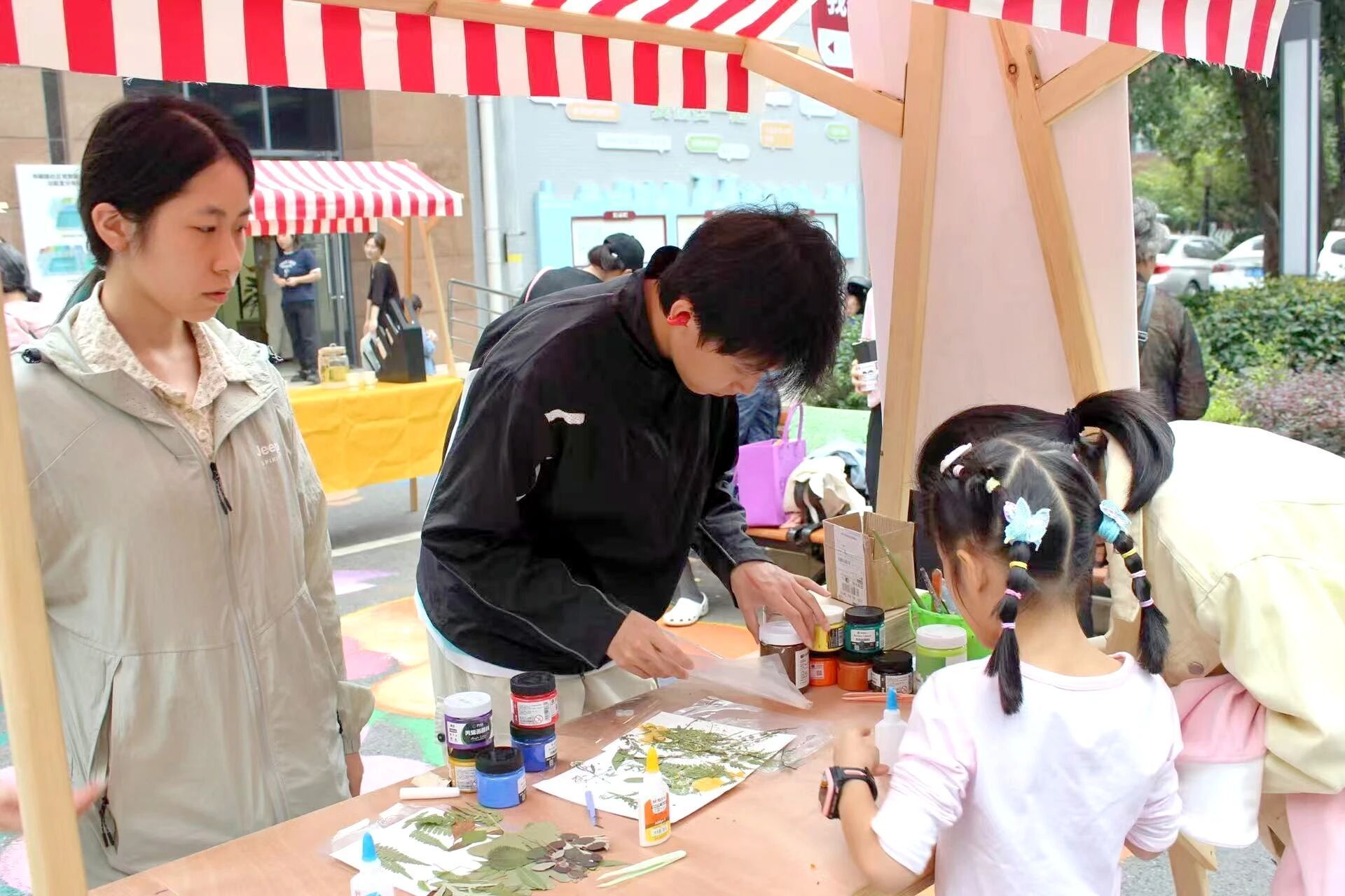 围绕成果展示,风景园林专业的学生们和社区一同策划了一场创意节。在改造好的“口袋公园”旁,孩子们在花箱间穿梭跑过,“废弃塑料瓶 + LED灯串+干花”变身30盏暖黄植物灯悬挂在绿道两侧;非遗织艺达人、社区居民李红阿姨支起“临时织铺”,手把手开展杯垫编织教学;利用干花制作的画框摆件成为了小朋友们光顾的热门摊位,粉白色的花瓣与绿叶相映,带着笑脸的太阳在画框的一角,是属于孩子们发挥想象后的专属之作。