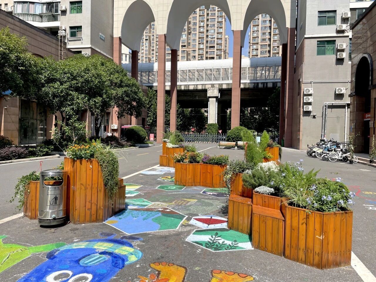 为了进一步完善改造,在地绘的基础上,学生们与辖区内的12组家庭一同对小区原有的多个蜂巢型木质花箱进行改造。搬盆栽、挖土、压实、浇水......100 株月季、鸢尾、迷迭香按“花境—菜畦—香草角”三区块植入,“小朋友通过种植体验,能更好地了解自然、亲近自然。”居民李女士带着女儿将最后一盆月季埋入土中,母女俩约定好要利用周末时间定期对自己亲手栽种月季的木箱进行养护。