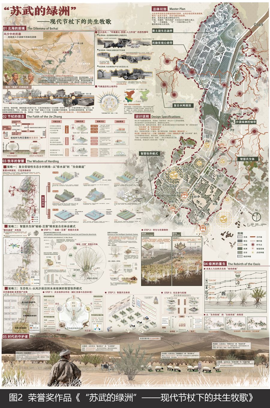 荣誉奖作品《“苏武的绿洲”——现代节杖下的共生牧歌》,由风景园林研究生唐婧、卢欣宁、田文英、宋杨洋共同完成(指导老师:邵继中)。作品以“苏武牧羊”的坚守精神为叙事内核,为面临水源枯竭、土地沙化与社区瓦解的民勤县提出生态修复方案。设计将“苏武牧羊”转化为隐喻指导生态修复策略和社区参与。通过构建“海绵峡谷”及“梭梭-苁蓉智慧共生体”,创立“守护者”社区网络,将村民转化为生态管护者,发展经济与碳汇交易,使生态修复成为可持续社区产业,为民勤及全球干旱区提供生态韧性、经济活力与文化传承相融合的“共生绿洲”范式。
