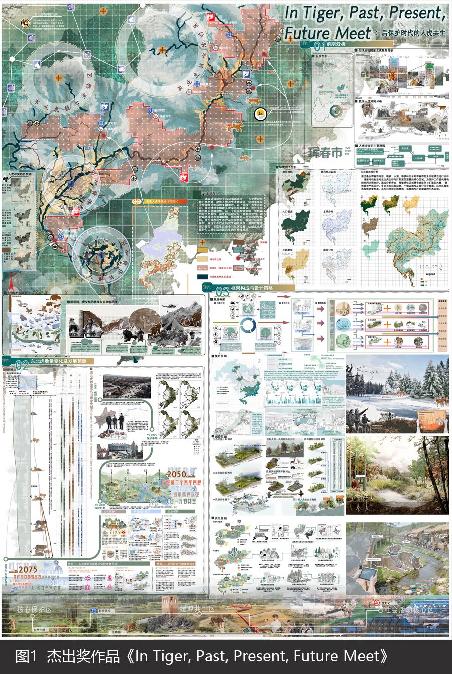 杰出奖作品《In Tiger, Past, Present, Future Meet——后保护时代的人虎共生》由风景园林研究生陈欣宇、李光媛、谭百权、吴境来、孔维萱共同完成(指导老师:杜雁),设计选址于吉林省珲春市东北虎现存核心栖息地,面对人虎共生矛盾演进这一复杂议题。团队以前瞻性视野,依据现有保护地虎群增长趋势,预设未来东北虎种群可能达到饱和后的关键挑战,构建了"预防-调控-共生"三位一体的系统性策略:通过科学划定生态基线前置规划,从源头规避冲突;搭建动态监测网络优化人虎时空格局;推动生态产品价值转化,实现生态效益与民生福祉共享。最终以缓冲带为纽带,成功串联生态安全与社区发展,为达成人虎和谐共生的可持续格局提供了可实施的景观规划路径。