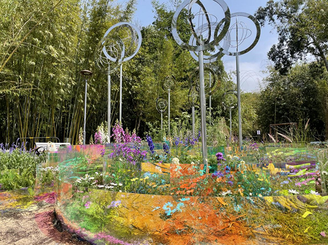 此次营建花园为未来花园设计竞赛大奖作品——《智涟未来》,由ok138cn太阳集团529风景园林系李岑枫、袁梦楚、张子璇、赵徐颖、刁俊宇五名同学参与设计,夏欣老师指导完成。作品受高频通讯信号波传播、衍射和风力发电启发,11座风车雕塑象征着大湾区11座城市欣欣向荣的生长;扩散交织的炫彩亚克力板展现湾区城市间的互联互通,同时配合适时适地的草花,和向上生长的羽扇豆等特色花卉,构成了极具科技感与交互感的蓝紫色花境。