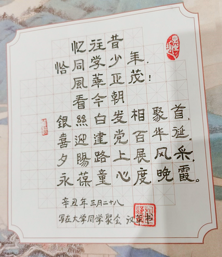 大家在国际交流中心举行了座谈交流,部分校友进行了书画作品、科技著作及才艺展示,以文会友。陈忠福、周捷可、郑世发等校友进行交流发言,各位校友在交流中纷纷表达对党的热爱,对学校的感恩,对同学友情的珍爱;部分校友代表回忆了离开狮子山后立足各自岗位,传承校训精神,扎根大地,到祖国最需要的地方建功立业的感人奋斗史;大家认为要紧跟时代步伐,安享晚年幸福生活,相约在毕业60周年时再相聚。陈忠福校友的祝福代表了大家的心声:“福如东海长流水,寿比南山不老松,耄耋之年奔期颐,福寿安康夕阳红。”部分校友通过在线方式和大家进行了交流。