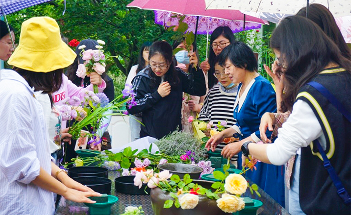 王彩云老师首先简单介绍了园艺疗法体验的基础常识和理论,提出园艺体验是以园艺场所和园艺行为为媒介,通过刺激或触发人体的五感,达到促进身心健康的一种自然体验。面对当前毕业本科生与研究生的毕业论文与就业焦虑现状,在万总协调组织下,王老师与华师大学工部领导、心理辅导老师以及各位班主任等一同在花园散步、菜园体验、观赏桃园树下鸡鸭鹅嬉闹,树林荷塘水鸟戏水、插花、压花、花园书屋与品茶等途径感受绿色的疗愈力。