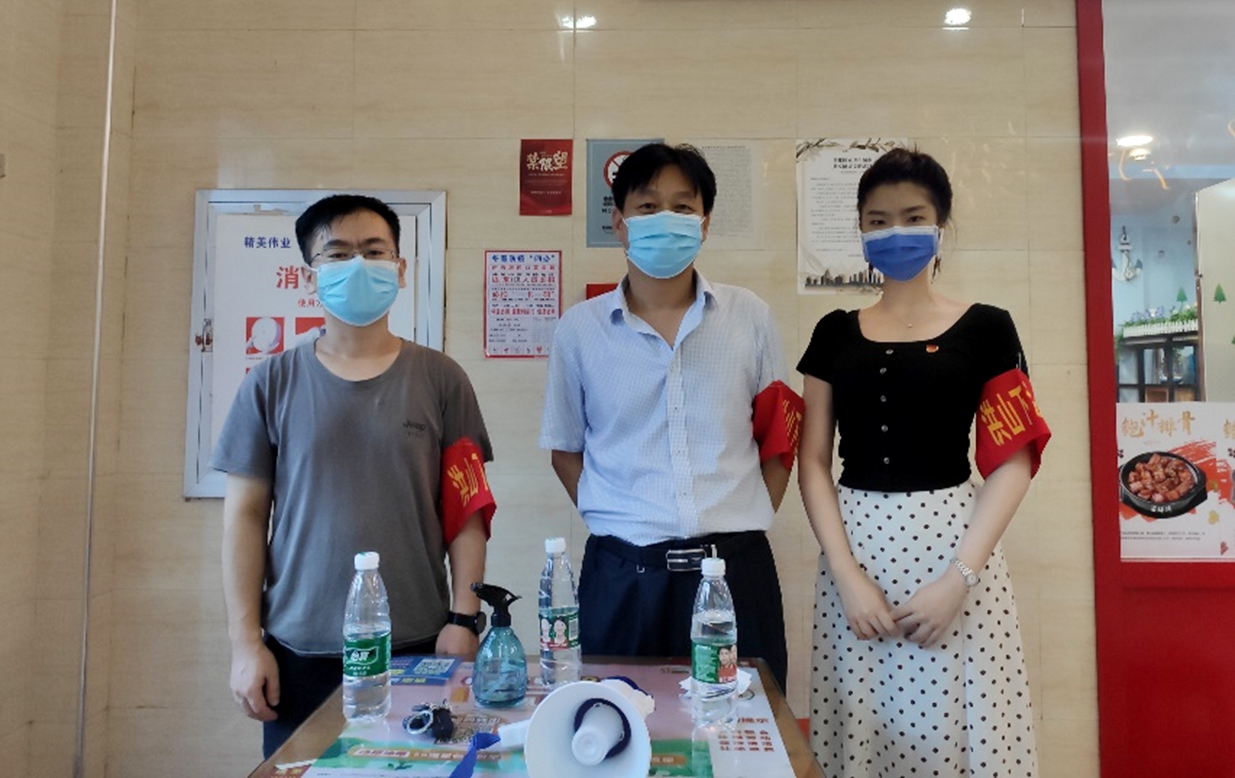 步行街的入口人来人往,多数行人都佩戴好口罩,主动测量体温,他们的理解与配合给予了在雨天坚守岗位的志愿者们温暖。党委副书记蔡江一边安排工作,一边叮嘱志愿者们:不端架子、沉下身子,不起冲突、热情服务,不马虎大意、做好个人防护,彰显下沉党员良好形象。