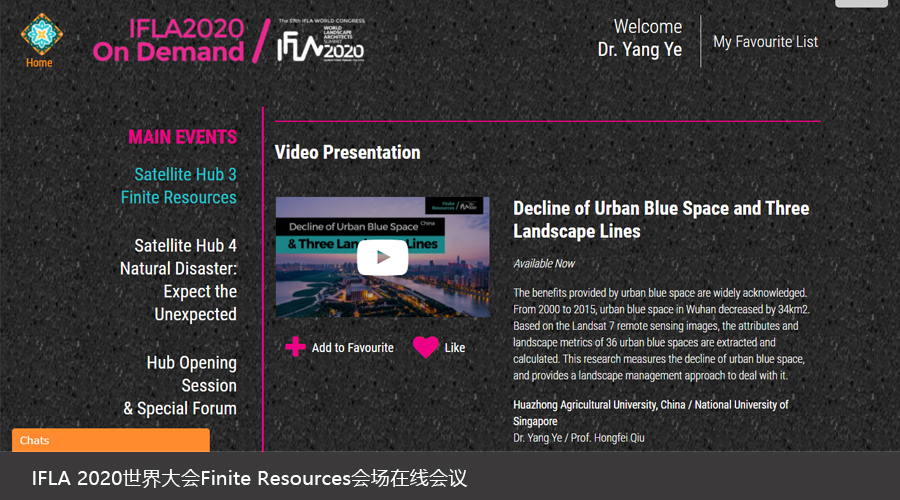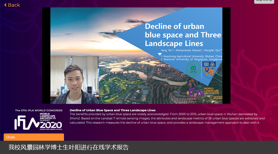 ok138cn太阳集团和新加坡国立大学联合培养博士生叶阳受邀参会,并在21日的“有限资源”(Finite Resources)会场中在线进行了题为《Decline of Urban Blue Space and Three Landscape Lines》的学术报告。研究测量了武汉市蓝色空间的衰退、提供了一种景观管理的应对方法,并提出风景园林规划设计应该维持有限的城市蓝色空间,以改善未来的生活条件和环境。报告引发了在线代表们的广泛讨论。该研究系我校裘鸿菲教授主持的国家自然科学基金面上项目(31770753)的阶段性成果,新加坡国立大学的Nawaz博士对本次报告提供了建议。