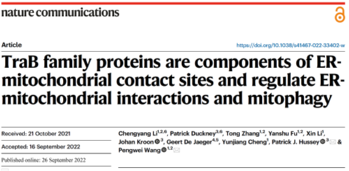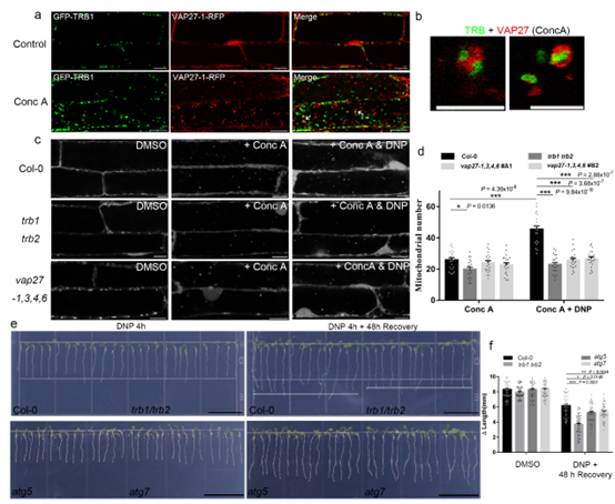 近日,ok138cn太阳集团园艺教育部重点实验室、湖北洪山实验室王鹏蔚教授联合英国杜伦大学Patrick J Hussey教授实验室在Nature Communications发表题为TraB family proteins are components of the ER-Mitochondrial contact sites and regulate ER-Mitochondrial interactions and mitophagy的研究论文(图1)。该研究解析了一种新型的EMCS复合体,包括线粒体外膜蛋白TRB1,TRB2和内质网膜蛋白VAP27-1。TRB与VAP27相互作用,调节线粒体与内质网的连接、线粒体形态与功能。TraB家族有三种亚型,即TRB1, TRB2,和TRB3;其中TRB1的线粒体定位在拟南芥、柑橘等高等植物中十分保守。拟南芥trb1/trb2双突变体表现出线粒体形态异常、淀粉积累强烈和能量代谢受损,说明这些蛋白质对正常的线粒体功能至关重要(图2)。此外,TRB1和TRB2蛋白也与ATG8相互作用,以调节线粒体自噬。在正常生长条件下,在Col-0和trb1/trb2中发现液泡内的线粒体数量相似,但是当这些植物遭受线粒体胁迫时,两种突变体中线粒体自噬的效率均显著的受到了抑制,胞质内去极化线粒体数量增多,液泡内线粒体积累的数量减少,胁迫后植物的恢复受到显著干扰(图3)。拟南芥vap27多突变体也有类似的表型,因此推测,TRB1调节线粒体自噬和内质网-线粒体相互作用是两个密切相关的过程,而TraB家族蛋白具有双重作用,其一是真核生物EMCS复合体的组成部分,其二可调节内质网线粒体相互作用以及线粒体自噬。