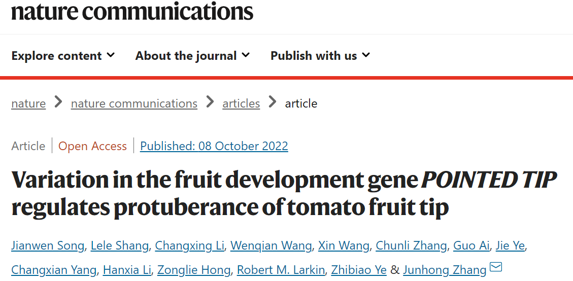 2022年10月8日,Nature Communications杂志在线发表了ok138cn太阳集团园艺植物生物学教育部重点实验室番茄团队题为"Variation in the fruit development genePOINTED TIPregulates protuberance oftomato fruit tip"的研究论文,该研究克隆鉴定了番茄果实(果尖)发育基因POINTED TIP(PT),揭示了该基因控制番茄果实远端形态的遗传基础及分子机理,为番茄果实远端形态的遗传改良提供了重要的理论基础和基因资源。