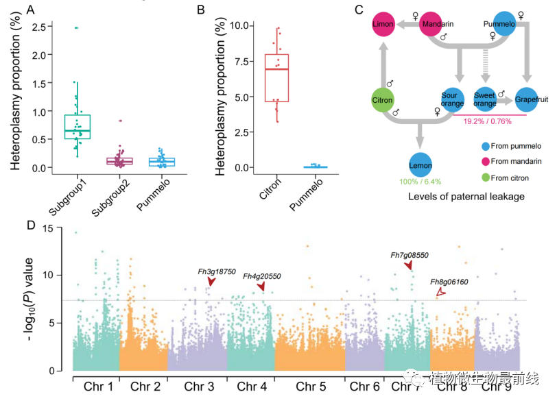 基于这一规律,该研究通过分析不同柑橘材料的线粒体基因组,构建线粒体泛基因组,通过比较分析鉴定到一系列物种特异性线粒体重组事件和物种特异性线粒体嵌合基因。进一步基于群体水平比较分析线粒体、叶绿体和核基因组的遗传分化水平,解析了柑橘线粒体基因组的分化特征,鉴定到橘和柚存在明显的线粒体基因组分化,与种间细胞融合导致雄性不育的表型一致。基于细胞工程创制的胞质杂种新材料及转录组测序分析,鉴定到线粒体基因组调控柑橘雄性不育的关键结构变异(图1B);利用全基因组关联分析鉴定到候选的核基因组恢复基因,可能参与柑橘雄性不育系统的建立;研究还发现柑橘杂交过程中线粒体基因组并非完全母系遗传,存在广泛的‘父系泄露’(图2),但叶绿体基因组在杂交过程中保持母系遗传。总之,该研究揭示了柑橘分化和驯化过程中产生雄性不育的遗传基础,解析了雄性不育对柑橘杂交模式的影响,阐明了细胞质基因组与核基因组互作在柑橘无核育种过程中的重要作用。