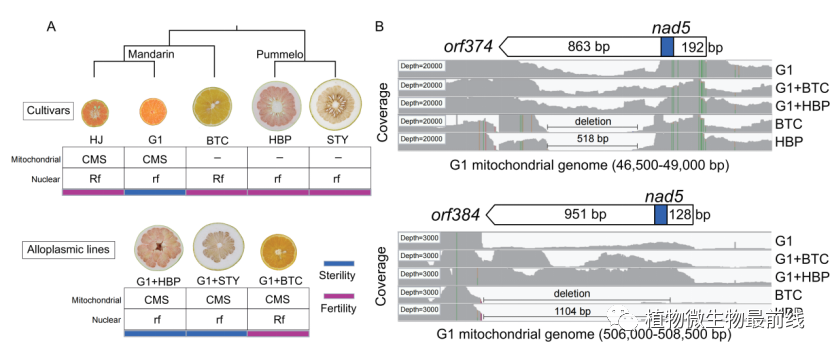 来自线粒体基因组的关键基因和核基因组的育性恢复基因之间的互作模式是导致柑橘雄性可育/不育的重要原因。利用来自不同遗传背景的线粒体基因组与核基因组的细胞融合,能产生雄性不育性状;特别是来自‘温州蜜柑’的线粒体基因组和栽培柚品种的核基因组导致花器官畸形、花粉败育,进而产生无核果实;而来自‘温州蜜柑’线粒体基因组与甜橙核基因组的细胞融合(核基因组为橘和柚的混合背景)不影响育性(图1A)。上述现象表明线粒体基因组与核基因组的互作模式存在种的特异性,且在橘与柚的分化过程中存在明显差异。
