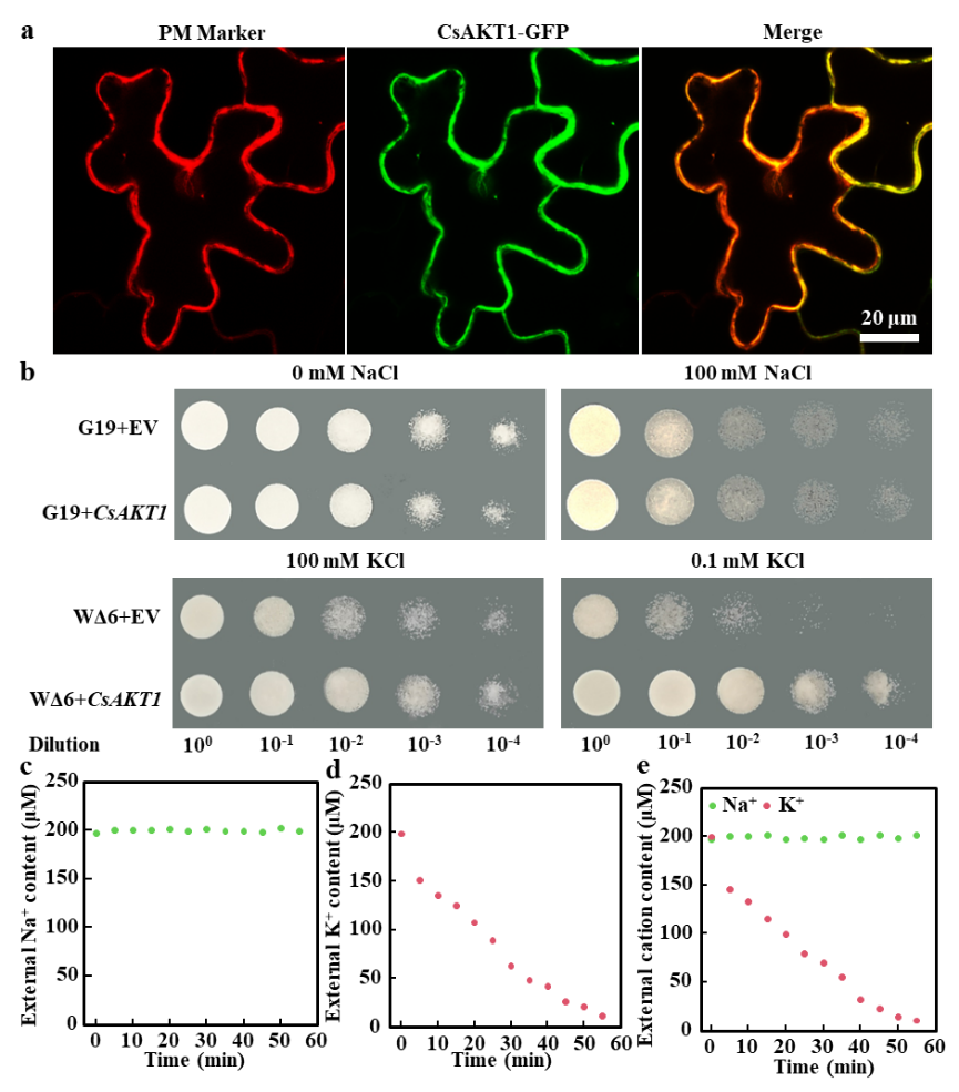 图3黄瓜CsAKT1亚细胞定位及离子转运特性分析
