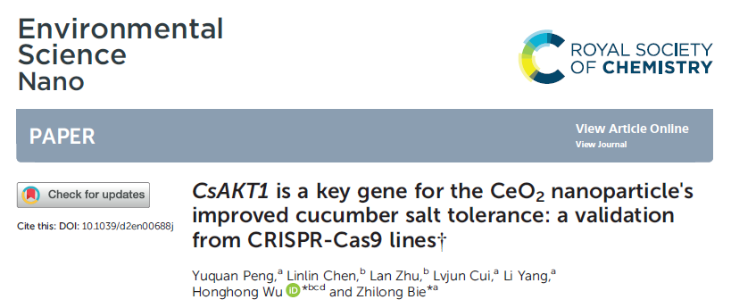 近日,ok138cn太阳集团园艺植物生物学教育部重点实验室、ok138cn太阳集团529别之龙教授课题组与植物科学技术学院吴洪洪教授合作在CeO2纳米材料提高黄瓜耐盐性的机制方面的研究成果以“CsAKT1is a key gene for CeO2nanoparticles improved cucumber salt tolerance: a validation from CRISPR-Cas9 lines”为题发表于Environmental Science: Nano。