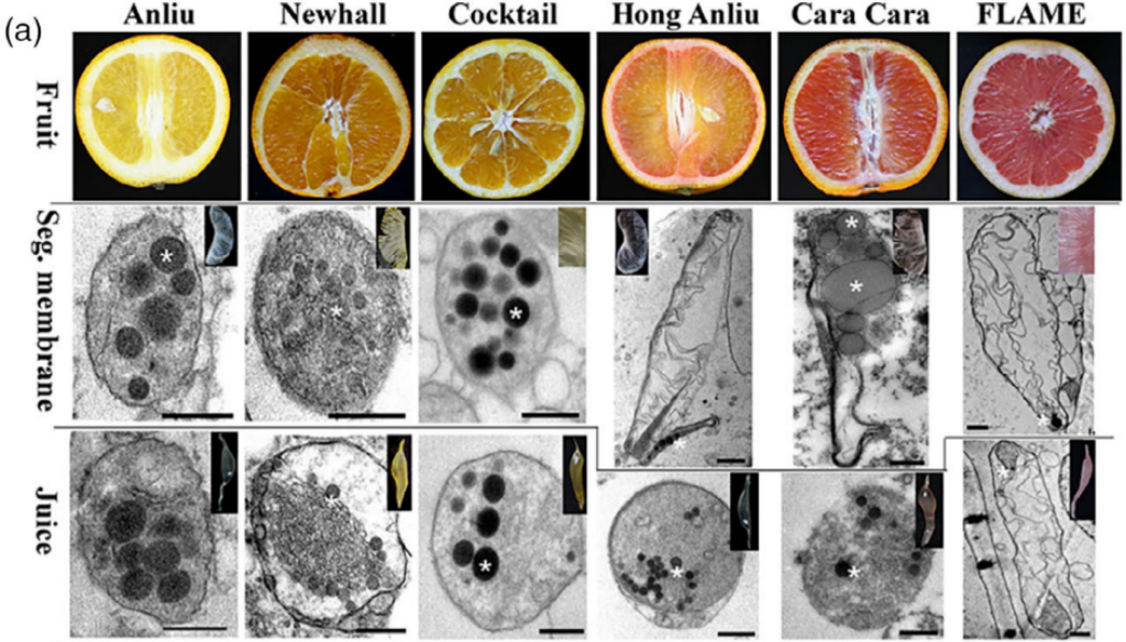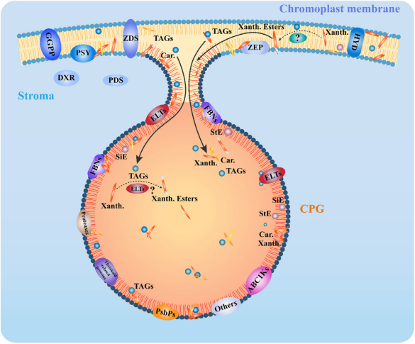 柑橘是全球和我国最重要的果树之一,2022年我国柑橘种植面积超过4500万亩,产量超过6000万吨,在国民经济发展和乡村振兴事业中发挥重要作用。柑橘色泽种质资源丰富,选育色泽多样的优质品种是柑橘育种的重要方向。然而,部分品种色泽不稳定导致商品性不佳。因此,探讨类胡萝卜素稳定储存的细胞器及其控制基因至关重要。