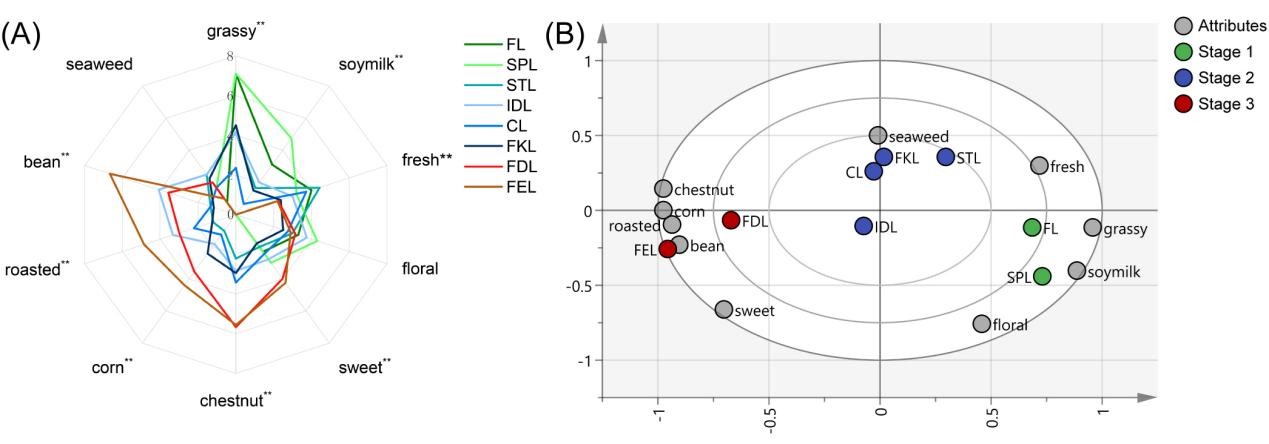 黄友谊教授课题组通过感官评价结合顶空固相微萃取与气相色谱质谱联用仪,探究工业化生产中恩施玉露香气特征与挥发性物质的动态变化。研究结果表明,恩施玉露成品茶香气特征可细分为清香、栗香、甜香等8个属性。在加工过程中,其香气由青草气转变为栗香、甜香和烘烤香。在恩施玉露加工全过程中鉴定到128种挥发性物质,其中醇类的占比最大,香叶醇和芳樟醇的含量最高。基于相对气味活性值初步构建了恩施玉露分子香气轮,其中芳樟醇、β-紫罗兰酮和壬醛是对恩施玉露香气品质贡献最大的挥发性物质。此外,通路分析表明,不饱和脂肪酸的非酶促降解可能有助于恩施玉露特征香气的形成,蒸汽杀青和足火是恩施玉露香气特征形成的关键步骤。这些结果对理解恩施玉露及其他蒸青绿茶的香气品质形成具有重要意义。