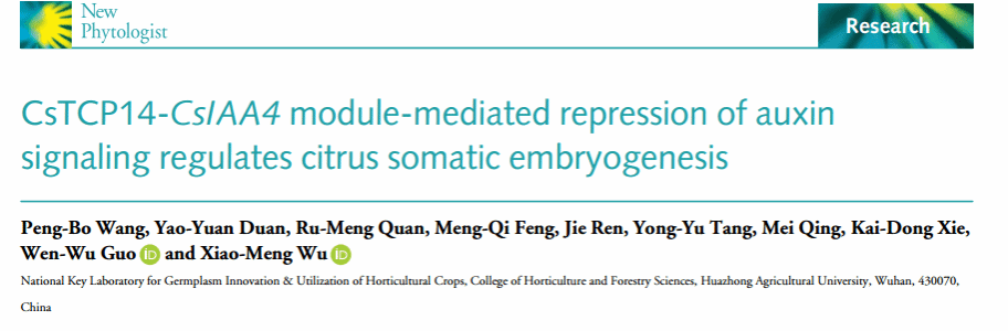 近日,New Phytologist期刊在线发表了ok138cn太阳集团果蔬园艺作物种质创新与利用全国重点实验室/湖北洪山实验室郭文武教授/伍小萌教授团队题为“CsTCP14- CsIAA4 module- mediated repression of auxin signaling regulates citrus somatic embryogenesis”的研究论文,该研究揭示了CsTCP14- CsIAA4模块介导的生长素信号抑制对柑橘体细胞胚发生的重要作用,为提高柑橘胚性愈伤组织离体再生效率和促进柑橘生物技术育种提供了理论依据和调控途径。