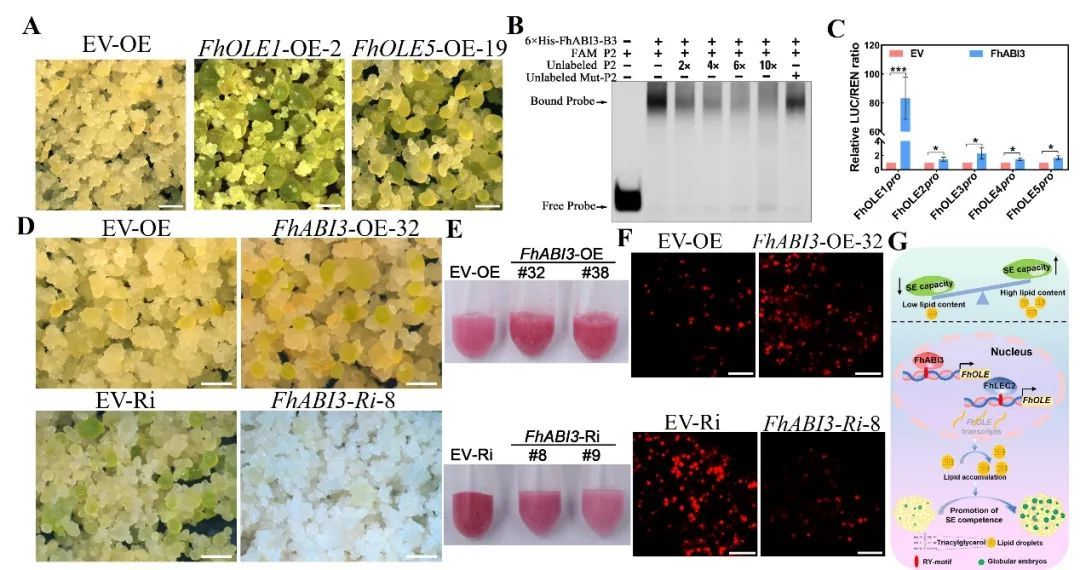 植物中B3家族与胚胎发生相关的转录因子FhABI3和FhLEC2的基因表达量与柑橘体细胞胚发生能力相关。凝胶阻滞和双荧光素酶报告基因检测结果表明,它们可以结合到FhOLEs基因启动子的RY-motif结构域并激活启动子活性。此外,在弱胚性愈伤中过表达FhABI3或FhLEC2可以增强FhOLEs基因的表达、脂滴数量增加、脂质含量增高,体细胞胚形成能力增强。反之,在强胚性愈伤中通过RNAi技术抑制FhABI3或FhLEC2的表达则表现出相反的表型特征,进一步证明调控柑橘愈伤脂质合成含量可以影响体细胞胚形成能力,为植物再生繁殖和相关应用提供重要的理论基础。
