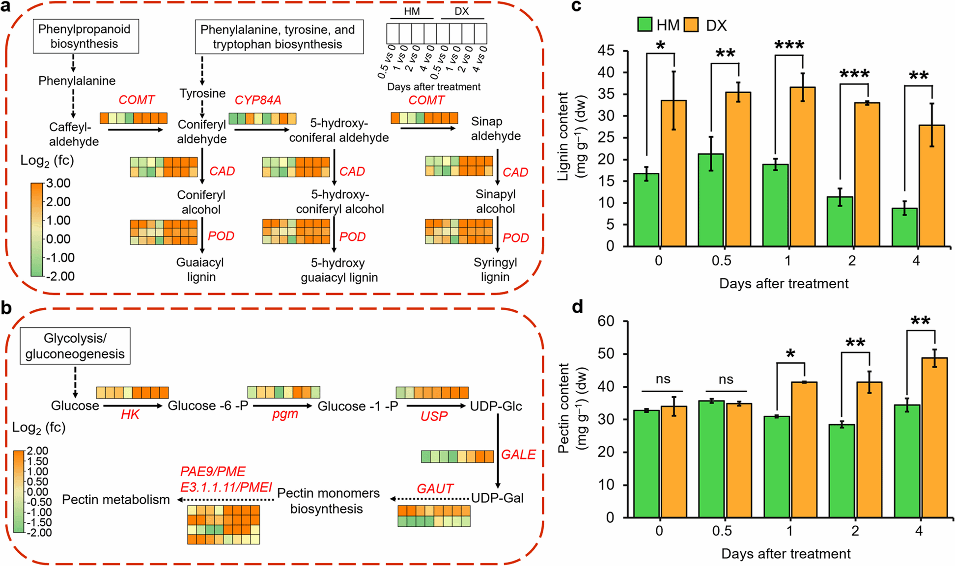 图2 涝害胁迫下‘湖景蜜露’(HM)和‘东溪小仙’(DX)叶片中细胞壁多糖差异表达基因(DEGs)及其含量