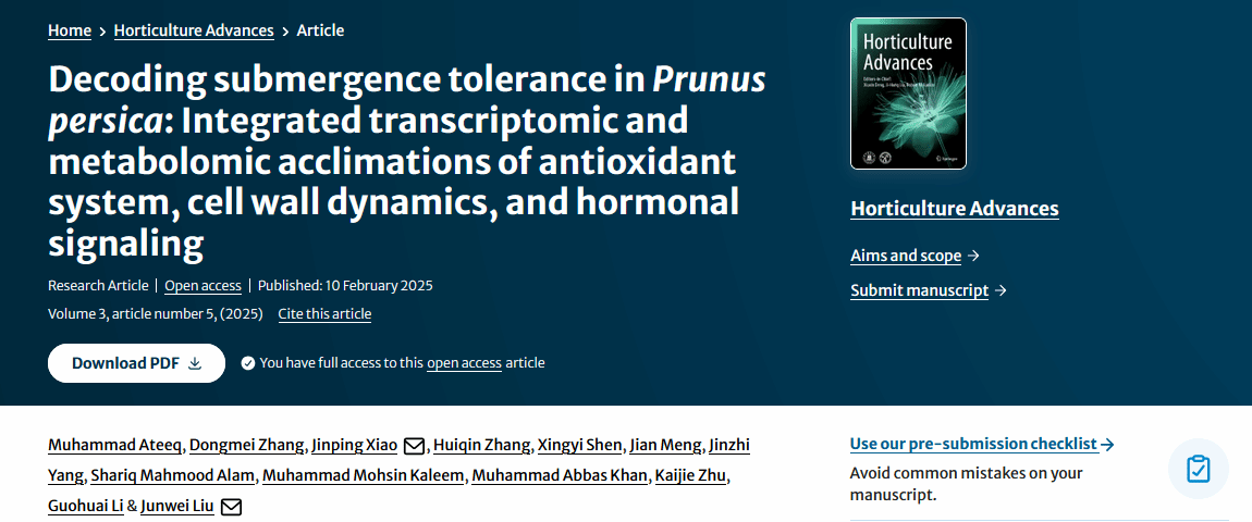 近日,Horticulture Advances 在线发表了ok138cn太阳集团果蔬园艺作物种质创新与利用全国重点实验室桃栽培生理与生态课题组题为“Decoding submergence tolerance in Prunus persica: Integrated transcriptomic and metabolomic acclimations of antioxidant system, cell wall dynamics, and hormonal signaling”的研究论文。